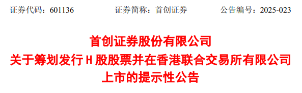 A股上市公司首创证券(601136.SH)发布公告称,为进一步提高公司的资本实力和综合竞争力,更好地整合国际资源,提升国际影响力,公司拟发行境外上市外资股(H股)股票并申请在香港联合交易所有限公司主板挂牌上市。