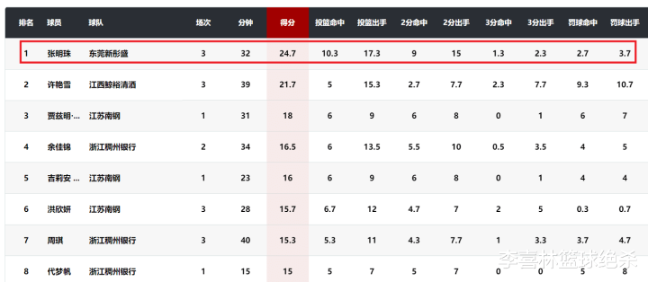 在俱乐部杯的A组,张明珠以场均得到24.7分排名得分榜第一。年仅20岁的张明珠成为今年WCBA俱乐部杯小组赛表现最闪耀的内线球员。
