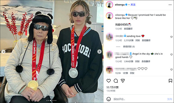 2月23日,谷爱凌在社交平台上晒出了和奶奶的合照,并配文“因为我答应过她,我会像她一样勇敢,我爱你奶奶。”